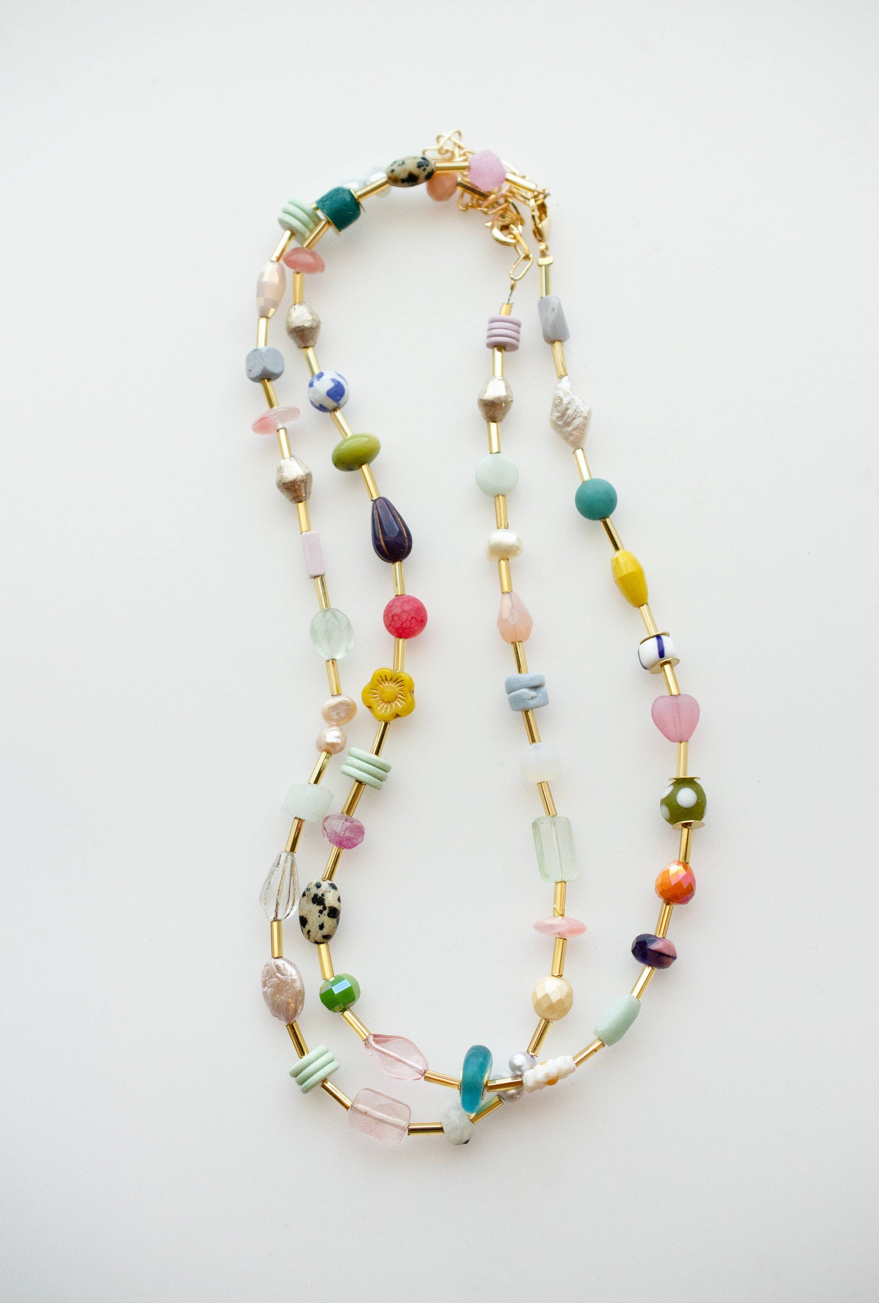This colorful beaded eclectic necklace is a joyful mix of glass, Czech, and gemstone beads, each one bringing its own personality to the strand. From soft pastels to bright pops and playful shapes, every detail feels collected and intentional. It sits beautifully at the collarbone and layers effortlessly, or shines all on its own. A thoughtful gift for someone who loves unique pieces and a splash of everyday color.