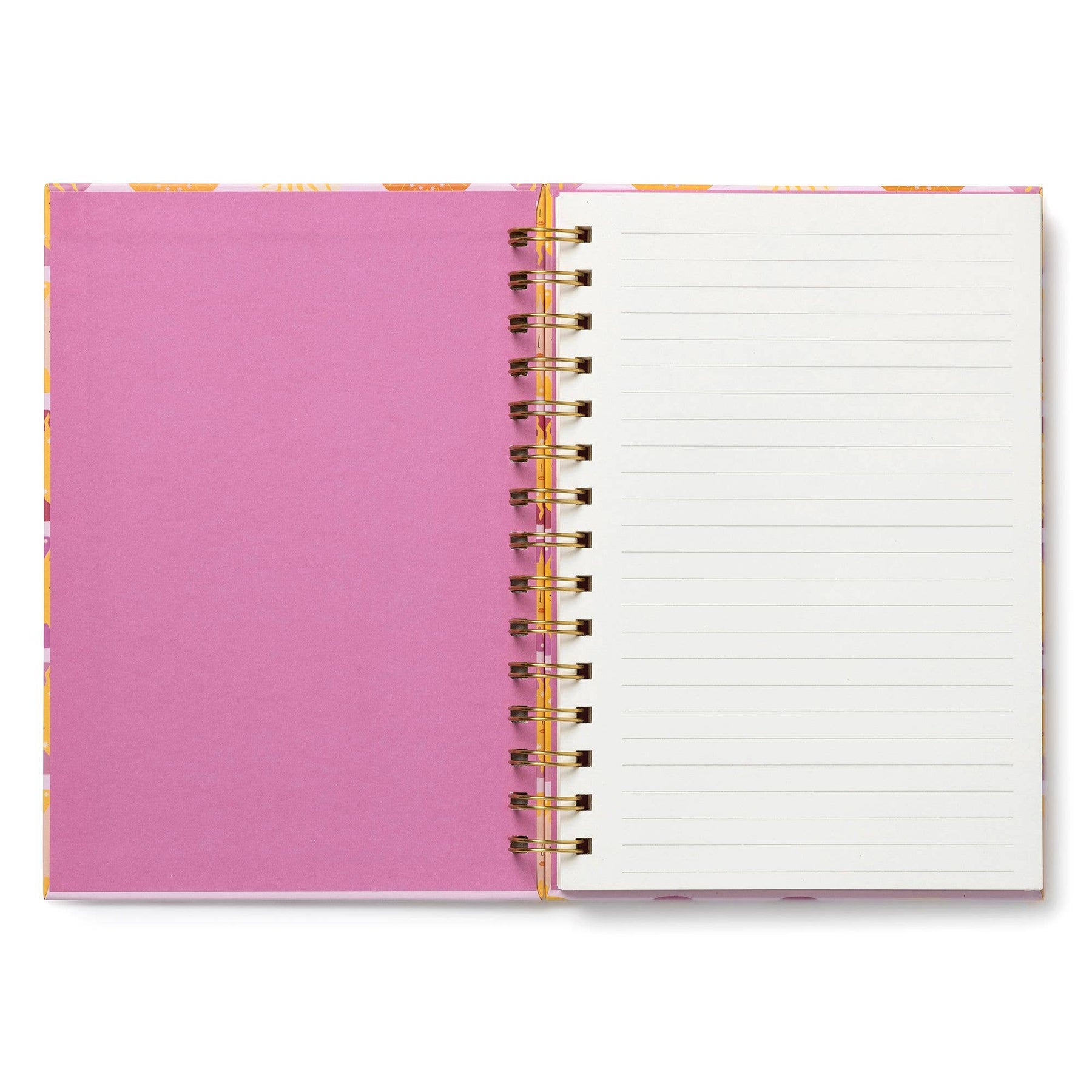This cheerful hardcover notebook brings happy vibes to everyday note-taking. Wrapped in a playful sun-print cover, it’s designed to feel sturdy, fun, and easy to use wherever inspiration strikes. The built-in vegan leather pen pocket keeps your favorite pen close, while the wire-o binding lets pages lie flat for smooth writing from start to finish. A thoughtful gift for list makers, journal keepers, or anyone who loves a good notebook moment.