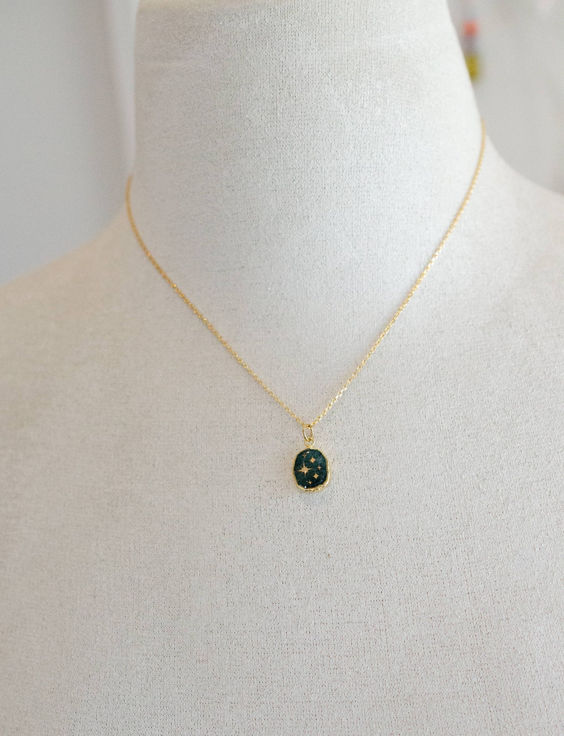 This celestial gemstone pendant necklace features a natural stone framed in gold plating, each one etched with a delicate sun, moon, or star motif. Choose from glowing moonstone with a radiant sun, deep onyx with a crescent moon, or vibrant apatite with scattered stars. Every pendant is one of a kind, with natural variations in color and texture that make it feel personal and special. It is a thoughtful gift for anyone drawn to meaningful symbols and a touch of cosmic charm.