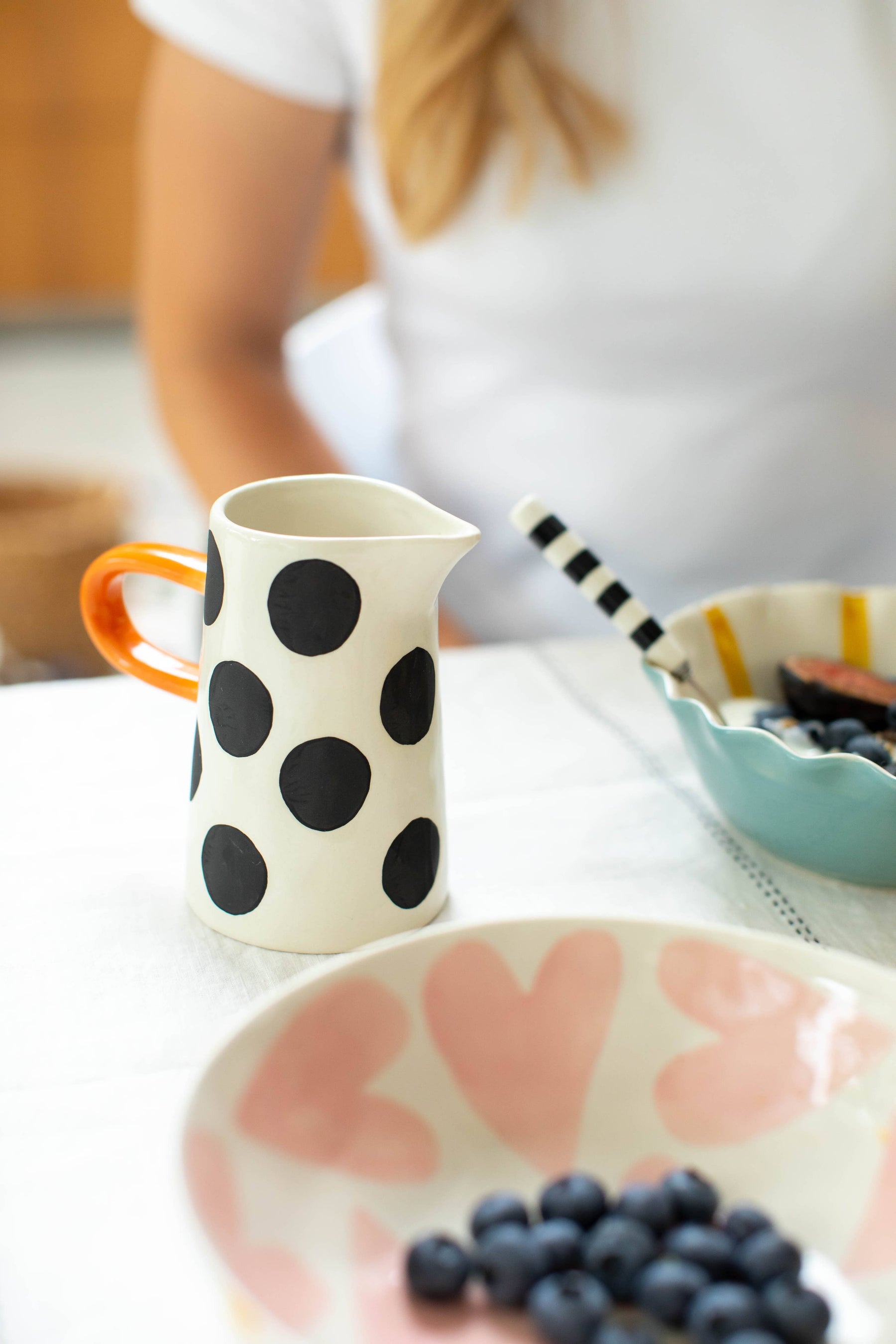 The Pink Hearts Mustard Round Shallow Bowl brings soft color and playful charm to the table. Featuring a hand painted heart pattern in blush pink with mustard accents, this shallow stoneware bowl is just right for morning fruit, afternoon snacks, or a cozy scoop of ice cream. Each piece is hand finished, giving it subtle variations that make it feel personal and gift worthy. It is an easy, thoughtful gift for housewarmings, birthdays, or anyone who loves a cheerful table.
