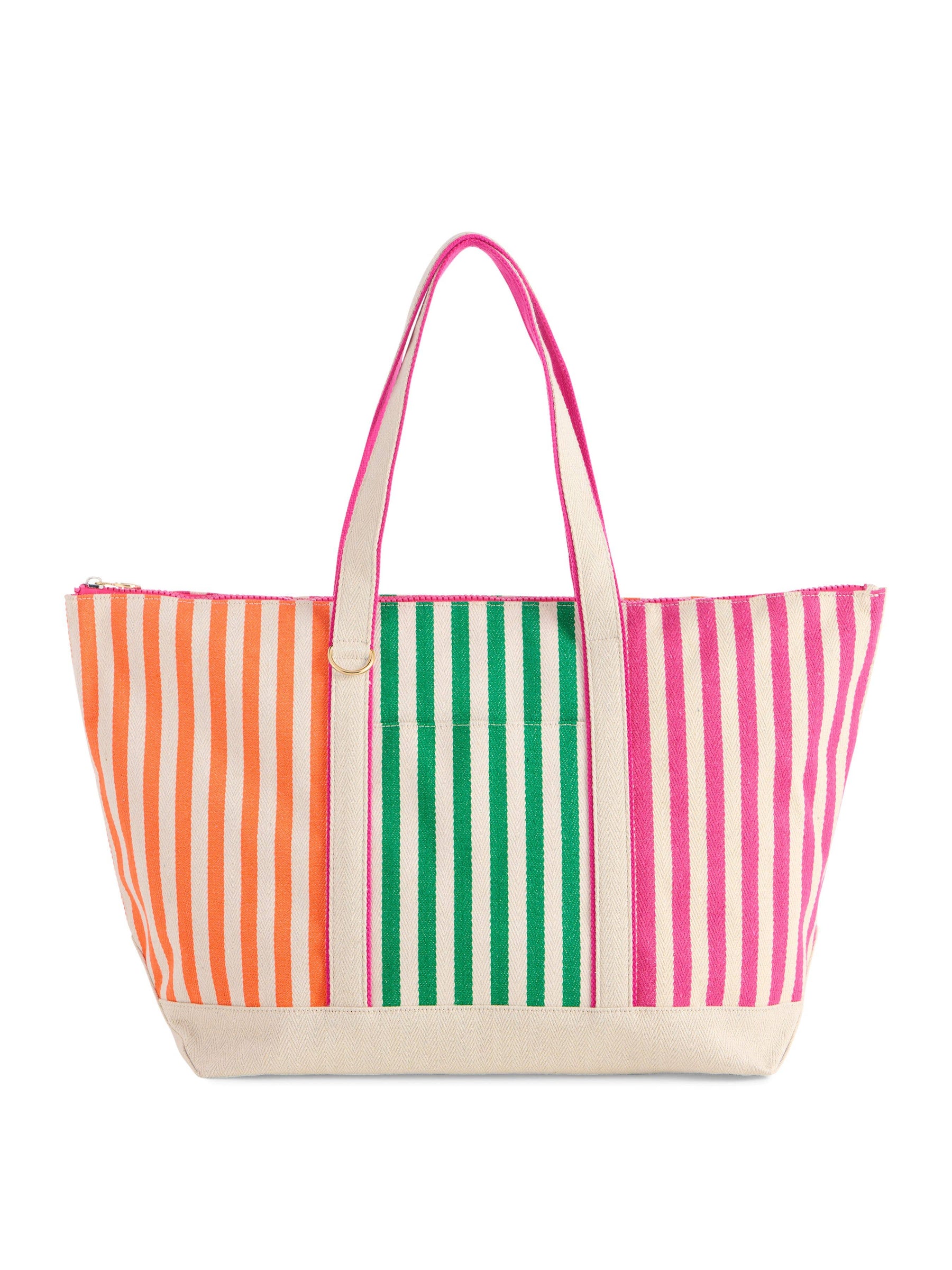 The Port Stripe Tote is the kind of bag that turns errands into something a little more fun. With its vibrant multicolor stripes and sturdy cotton build, it is roomy enough for beach days, market runs, overpacked work days, or weekend getaways. The double shoulder straps sit comfortably, while the top zip closure keeps everything secure. It is a standout gift for anyone who loves practical pieces with plenty of personality.