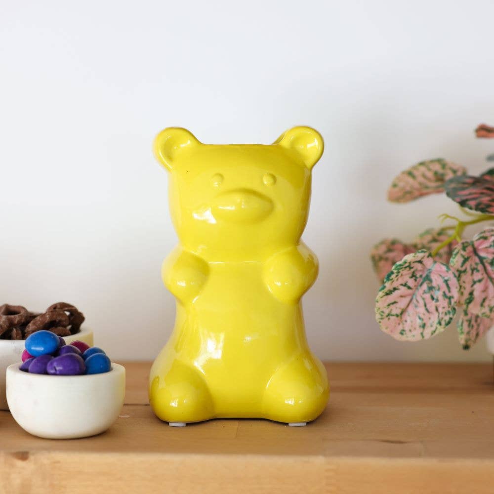 A sweet little pop of personality. This ceramic gummy bear vase brings playful charm to shelves, desks, and small spaces with its glossy yellow finish and sculptural shape.