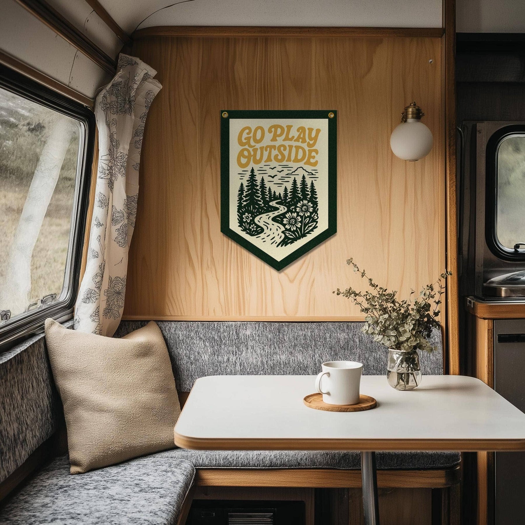 The Go Play Outside Felt Camp Flag is a bold, retro-style wall banner designed to inspire curiosity, movement, and a love of the outdoors. Featuring hand-drawn mountains, trees, and winding trails paired with cheerful typography, this decorative felt flag adds instant personality to kids’ rooms, playrooms, cabins, nurseries, and cozy reading corners.