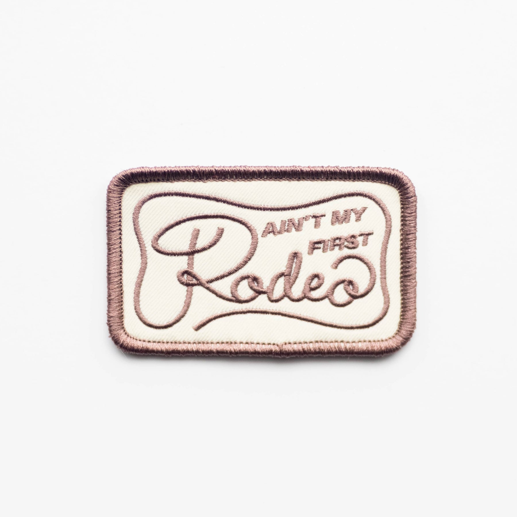 This embroidered iron-on patch features the phrase “Ain’t My First Rodeo” stitched in rich brown thread on a warm beige background. With its timeless cowboy-inspired script and clean rectangular shape, it feels effortlessly rugged and self-assured. Perfect for denim jackets, hats, or bags, this patch lets you show a little grit and humor—no explanations needed.