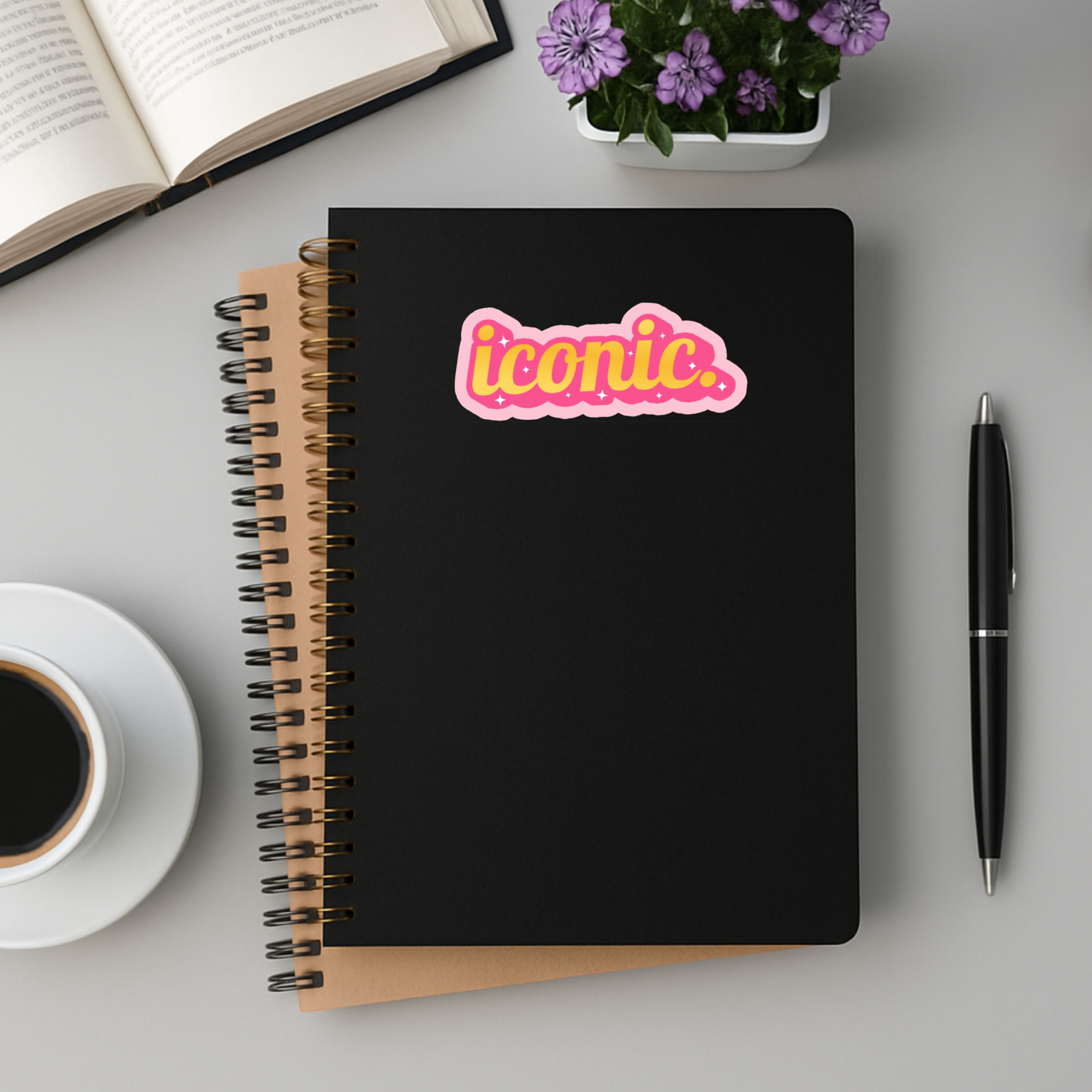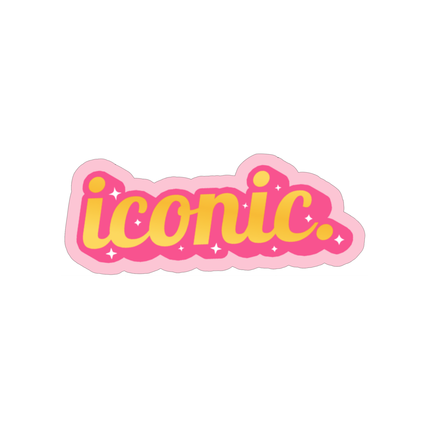 • Design: “iconic.” in yellow + hot pink with sparkles