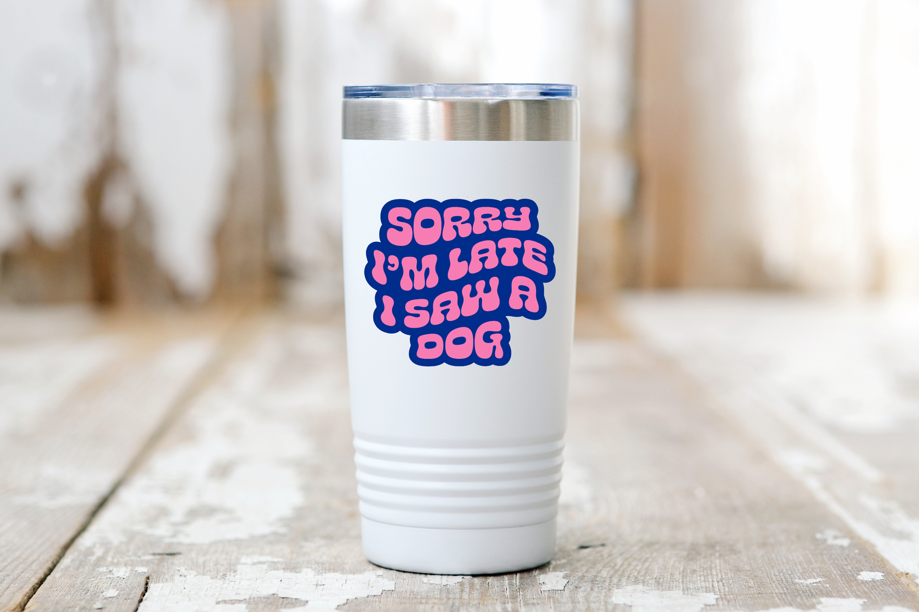 This playful vinyl sticker spells it out in bold, bubbly lettering with bright pink text outlined in deep blue. “Sorry I’m late I saw a dog” feels instantly relatable and proudly unapologetic. It’s cheerful, funny, and full of personality, making it a great little gift for anyone whose schedule is regularly derailed by puppies, walks, and unexpected pets.
