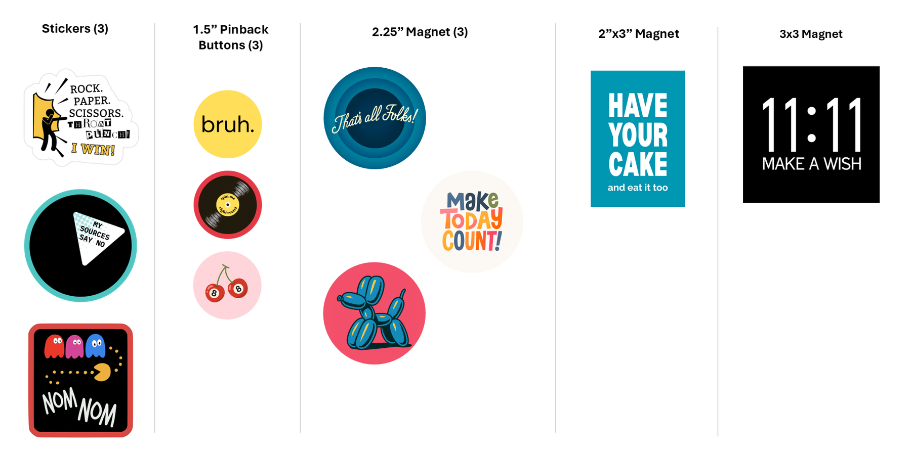 Magnets and buttons are printed with crisp detail and a shiny finish. Stickers are made with durable, water-resistant vinyl.